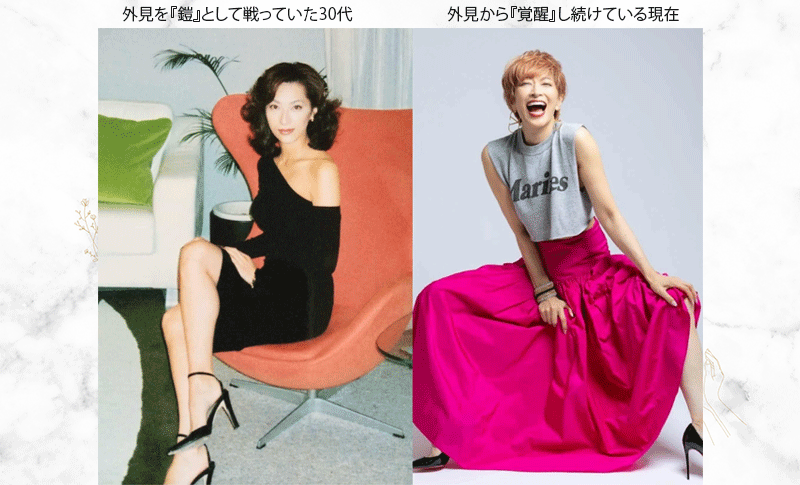30歳で出会った2人目の夫は、「女性はゴージャスであるべし」という独自の美学を持ち、私にメイクやネイルを施し、美しいブランドの服を湯水の如く与えてくれた。まるで映画「プリティウーマン」の世界。私の外見力においての基盤を作った「H&Mからクリスチャン・ディオールまで」というキャッチコピーは、 当時の毎月100万円以上を“お洒落”に注いだ実体験から生まれたもの。 価格に関係なく本物を見極め、最良のものを選び取る力―その審美眼と経験から培った幅広い情報量で創造する変身力の土台がこの時期に築かれた。